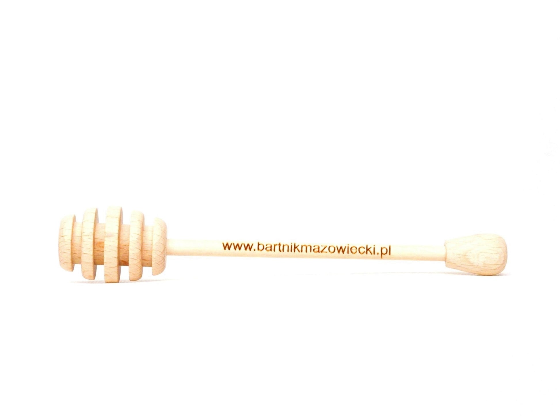 Nabierak drewniany do miodu z wypalonym logo pasieki Bartnika Mazowieckiego. Produkt polski, wyprodukowany w polskiej firmie zajmującej się produkcją wyrobów z drewna. Drewniany czerpak do płynnego miodu świetnie sprawdzi się jako kuchenny gadżet którym nabierzesz płynny miód z naszej pasieki. Nabierak do miodu to także ładna ozdoba Twojej kuchni lub przyjemny dodatek do prezentu. Nabieraki drewniane stanowią jeden z elementów naszych zestawów prezentowych z miodem.Nabierakami drewnianymi z łatwością nabierzesz także miody kremowe, o miękkiej, delikatnej konsystencji. Spróbuj naszych miodów z dodatkami takich jak miód z maliną, miód z kakao, miód z cynamonem lub miód z imbirem albo miód z jabłkiem. Pysznie smakują wyjadane łyżką prosto ze słoika!