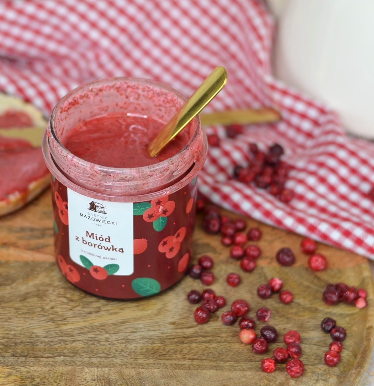 Miód z borówką to połączenie najlepszego miodu wielokwiatowego z polskiej, rodzinnej pasieki na Mazowszu i owoców borówki