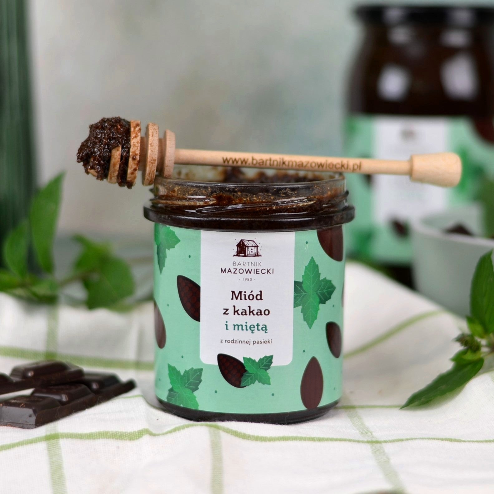 To oryginalna kompozycja naturalnego miodu wielokwiatowego z dodatkiem kakao i orzeźwiającej mięty – połączenie słodyczy, głębi i świeżości.