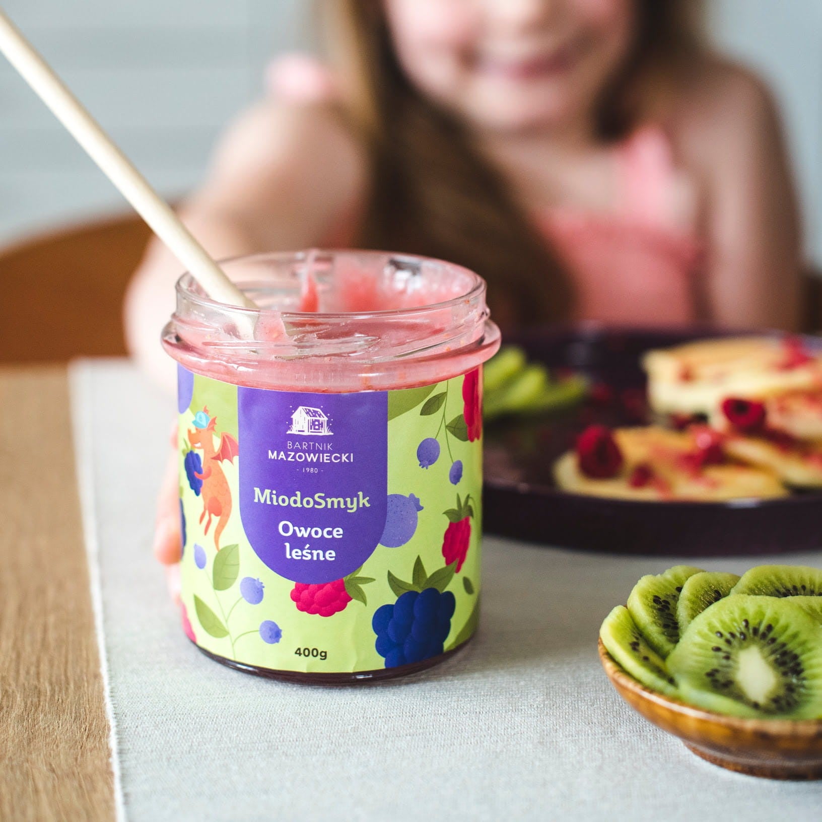 MiodoSmyk z owocami leśnymi to pyszne połączenie miodu wielokwiatowego i leśnych owoców. Miód idealny dla dzieci!