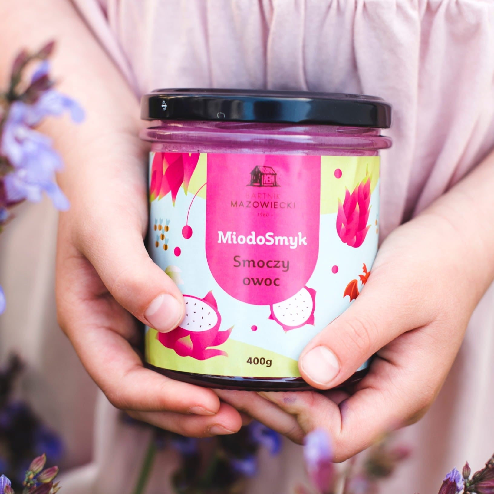 Słodki Cud Natury MiodoSmyk z pitają powstał z myślą o preferencjach smakowych Twojego dziecka. Naturalna słodycz miodu wielokwiatowego łączy się z unikalnym smakiem pitai, tworząc niezwykłą harmonię smakową. Dodaj MiodoSmyk na kanapkę, do sałatki czy smoothie bądź wyjadaj go łyżeczką wprost ze słoika.